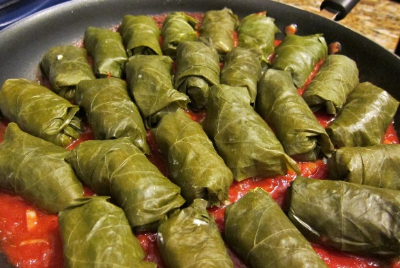 Лозови листа в зависимост от големината на тавата, в която ще ги наредите – 40-50 броя – предварително попарени с вряла вода;
