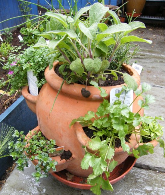 • подбрани пълзящи билки (например риган, няколко вида майоран и ягоди) и растение, което да расте нагоре (например скевола) в саксии или други съдове