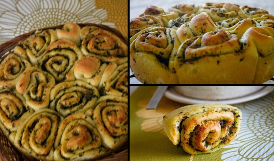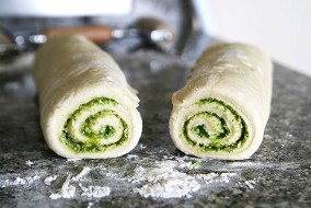 След като втаса тестото (около 1 час, ако е на топличко), разстелете го върху набрашнена повърхност във формата на правоъгълник. Намажете повърхността равномерно с песто и поръсете с настърган кашкавал или сирене. Навийте на руло по дългата страна и затиснете добре края, за да се запечата. Нарежете на равни парчета (получават се около 12) и ги поставете в намаслена тавичка с нарязаната страна нагоре. Покрийте с влажна кърпа и оставете да втасват още 30 минути. Загрейте фурната за пет минути преди да поставите тавичката с хляба да се пече. Пече се до златисто кафяво на 200 градуса (за около 25 минути).