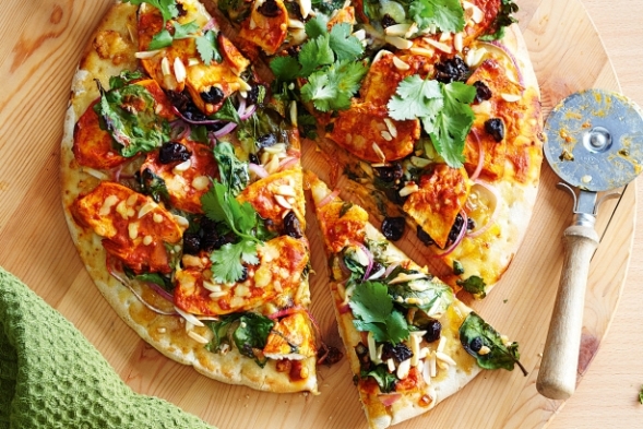 Традиционната тънка хрупкава пица тук е гарнирана по азиатски с крехко пиле тандури и кашу.