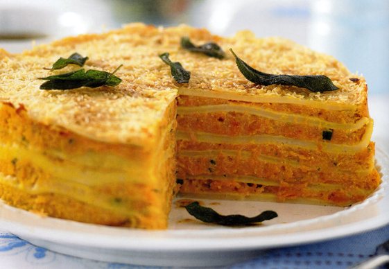 - Загрейте предварително фурната до 180 °С. Намажете с малко зехтин форма за торта с диаметър 20 см. Най-отдолу сложете една палачинка, а върху нея разстелете от тиквената смес. Подредете по същия начин и останалите пластове, като завършите с палачинка. Леко притиснете надолу и поръсете допълнително със сирене. Печете 15 минути или до златисто.