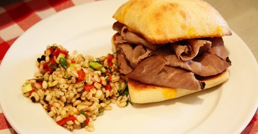Комбинацията от домати, краставици, билки и булгур е неустоима и е свежо допълнение към сандвичите с телешко месо и сирене.