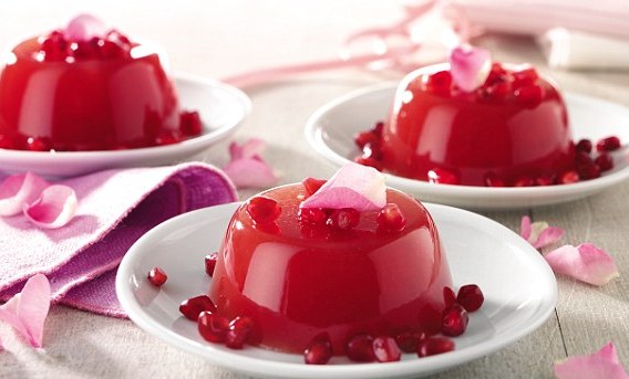 - Разпределете сместа в подходящи чаши и сложете в хладилник поне за 8 часа или докато желатинът се стегне. Поднесете желето като обърнете чашите в чинийки и гарнирате с червените плодчета и сметаната. Добавете и няколко листенца от рози.
