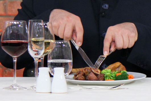 Щом още през XIX век са писали: „Старай се, колкото е възможно, да не вземаш с ръка храната“, то и сега се смята за правилно даже най-дребните птици да се ядат с нож и вилица. За да не се подхлъзне кръглият кокал от чинията на масата, е по-добре да не се дояде месото по него. Месото се яде заедно с подправката. Обикновено рибата не се яде с нож, но и тук не минава без изключения. Например твърдата кожа на змиорката може да се реже само с нож, както и солената селда. Изобщо за рибните блюда съществуват специални рибни нож и вилица. Ако те липсват, се използват две вилици. С вилицата, която е в лявата ръка, се яде, а с тази в дясната си помагаме при разчленяване на рибата. Ако на масата има само една вилица, то тя се държи с дясната ръка, а с коричката хляб в лявата ръка се придържа рибата. От пушената риба отначало се отделя кожата, след това се отделя месото от костите. След като горната част е изядена, рибата се обръща на другата страна и се яде по същия начин нататък. Рибата се разчленява като месото на малки парченца. Старайте се да не вадите пред погледите на всички рибените костички от устата си. Ножът за риба (втората вилица) се използва, за да не се прережат нежните рибени кости и след това да не отиват заедно с месото в устата.