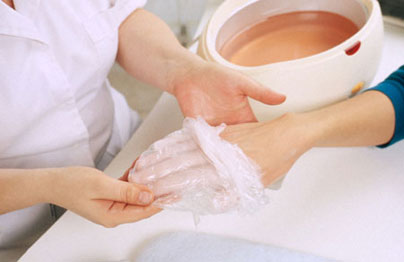 В домашния салон първо почистете кожата със скраб, за да я ексфолирате. След това нанесете хидратиращ крем и си направете масаж. Разтопете козметичния парафин на водна баня в широк емайлиран съд, като внимавате да не капне в него вода. Махнете от котлона и щом температурата стане поносима, топнете едната ръка за няколко секунди, после другата. След 10 секунди повторете и така няколко пъти, докато ръцете се покрият с дебел слой парафин. Увийте ги с фолио и ги пъхнете в ръкавици. След 30 минути, когато парафинът стегне, го отлепете.