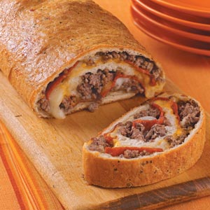 В отделен съд смесете съставките за пълнежа. Разточете тестото във формата на квадрат и го намажете с олио. Разпределете равномерно сместа от каймата, сиренето, лука, подправките и накрая наредете лентичките от червените чушки. Навийте на руло и запечатайте добре краищата.
