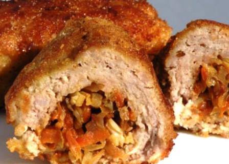 По ръба на по-дългата страна на пласта месо разстелете плънката от ситно нарязани гъби, твърдо свареното яйце – на кубчета и горчицата.