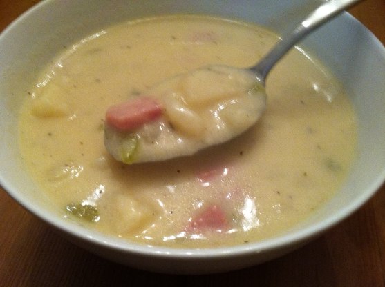Сложете млякото да заври в тенджера и добавете моркова, картофите, половината от сиренето (натрошено), пушеното филе, малко сол и черен пипер. Сложете и пресния лук и оставете да ври още 15 минути. Свалете от котлона, добавете останалото натрошено сирене и заквасената сметана с бъркане, за да не се пресече.