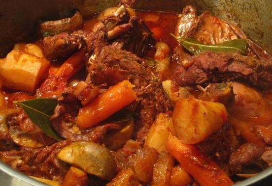 Извадете за час на стайна температура и започнете да редите гювеча: най-отдолу гъбите – обърнати и с по мъничко масло, върху тях порциите заек, поръсени с нарязания лук.