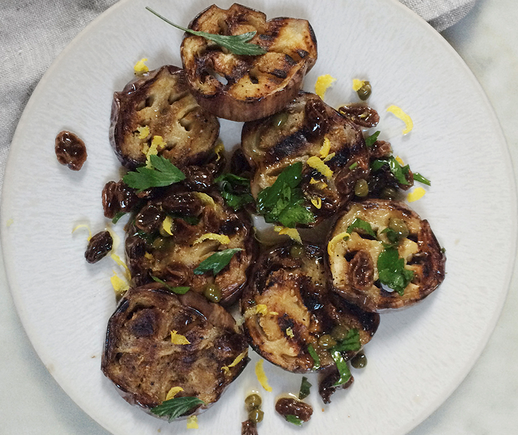 Смесете ⅓ чаша зехтин или олио, 1 чаша прясно нарязан магданоз, настъргана кора от 1 лимон, ¼ чаша каперси, ¼ чаша стафиди, 1 супена лъжица червен винен оцет, ¾ чаена лъжичка сол и ¼ чаена лъжичка черен пипер в средно голяма купа. Поръсете печените патладжани с този сос и оставете на масата, за да може всеки да си взима допълнително.