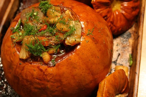 Сервирането става като отрежете едно парче от тиквата и го гарнирате в чинията с плънка.