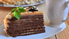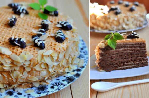 Шоколадово-медените блатове са скрепени с яйчен крем, което прави тортата нежна и мека.