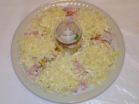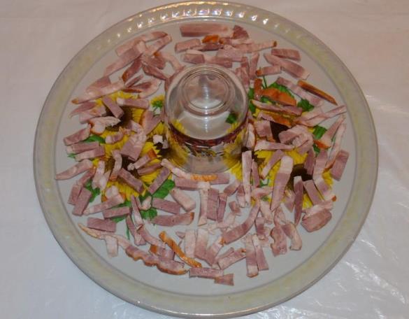 Вземете голяма чиния и в центъра поставете обърната стъклена чаша, около която наредете първия слой от нарязаното пушено месо.