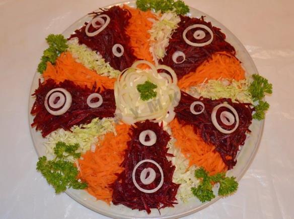 Наредете следващия слой от цвекло, така че да припокрива половината моркови и частично зелето. Извадете чашата и в дупката сложете майонеза.
