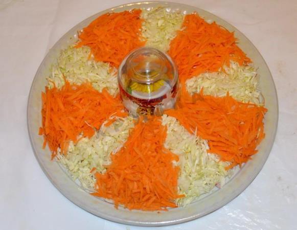 След това се разделете на око няколко приблизително равни части, като венчелистчетата на цвете и наредете нарязаното зеле.