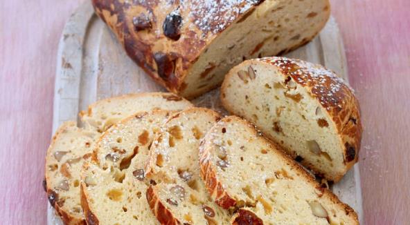 Съдържа нарязани на ситно сушени или захаросани плодове, ядки, ароматни подправки и е покрит отгоре с кристална или пудра захар или с глазура от разбити белтъци и захар.(Уикипедия)