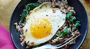 3. Чукнете яйцата в съда от приготвянето на спанака и ориза, сложете около тях и двете филийки бекон.