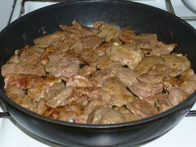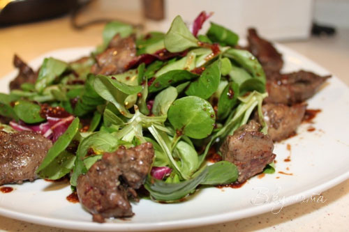 Снимки от pojrem.ru – пържене на дробчетата; kuharka.com – дробчета със салата