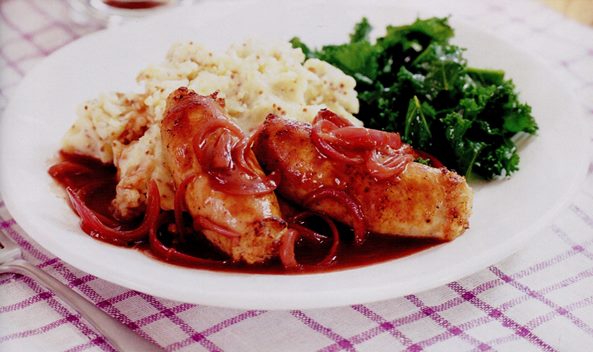Пълнозърнестата горчица придава пикантност на кадифеното пюре, а червеното вино – сила на лучения сос. Сервирайте със сезонни зелени зеленчуци.