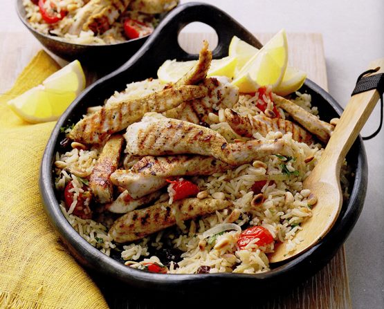 - Докато оризът се вари, изпечете в грила или в оребрен тиган пилешкото за 6-8 минути (докато стане готово), като обърнете веднъж. Прехвърлете пилафа в чиния за сервиране и поставете пилето отгоре. Сервирайте с резени лимон.