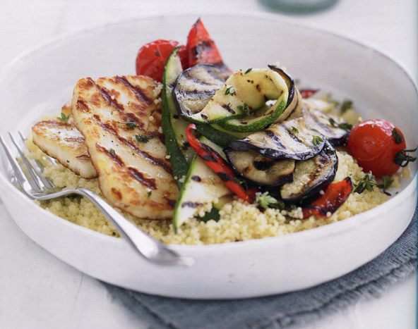 Докато сиренето се пече, сложете кускуса в топлоустойчива купа за сервиране и го залейте с бульона. Разбъркайте внимателно, след което покрийте и оставете да кисне 5 минути. Добавете останалата смес с чесъна и мащерката и сервирайте със сиренето и зеленчуците.