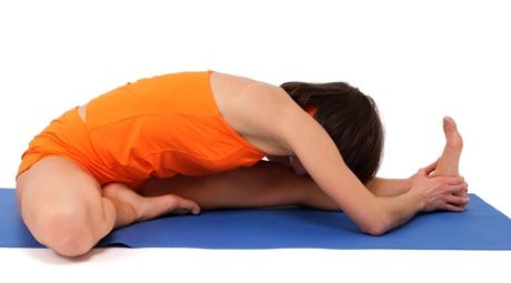 УПРАЖНЕНИЕ 1 – Това е извиване напред в седнало положение – дандасана, придвижване към позата на главата, долепена до коляното – джану сирсасана.