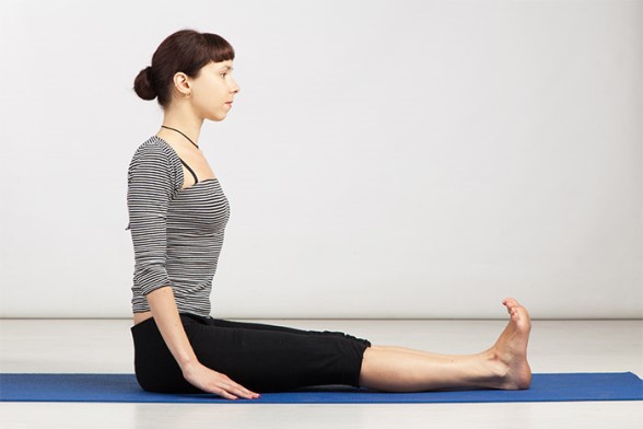 1 -Започнете, като заемете позата дандасана – краката право напред, ръцете до хълбоците, гърбът – изправен.