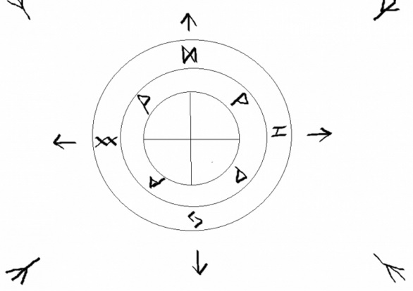 Кръговете се охраняват от четири руни Тейваз, разположени по посоките на света -това е защита от всякакви астрални нападения, опасности, лоши очи, зли думи. По ъглите на олтаря е разположен символ, състоящ се от руните Иса, Кано, Алгиз.Това са олтарни руни, предпазващи от опасности и благославящи вътрешното пространство, пише „Феномен“. Излезлите извън границите на кръга руни имат спомагателно значение.