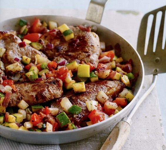 Бързият и пъстроцветен сос от зеленчуци е вкусно допълнение към сочните жарени агнешки стекове.