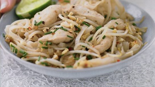 Пригответе яйцата – Избутайте пилето в едния край на тигана, за да направите място за яйцата. Сипете яйцата и бъркайте внимателно, докато леко се стегнат. Добавете отцедените спагети и 3 супени лъжици вода. Прибавете магданоза, соевия сос и лимоновия сок и бъркайте заедно със спагетите, пилето и яйцата 2 минути.