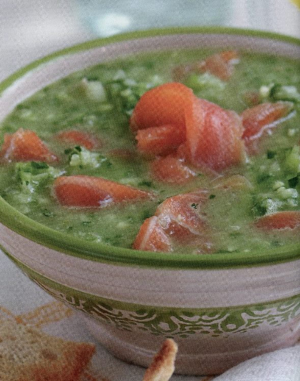 Сложете 1 филия бял хляб в кухненски робот и добавете 1 нарязана червена чушка, 1 нарязана глава червен лук, 400 г консерва от продълговати домати с чесън, 1 обелена и нарязана краставица, 1 люта червена чушка (без семената, ако не искате да е много люто), 300 мл зеленчуков бульон, от кубчета, 3 супени лъжици олио, 3 супени лъжици винен оцет и 2 супени лъжици нарязана прясна мента. Посолете. Пасирайте, докато сместа стане гладка, след което сипете в купи. Добавете по няколко кубчета лед във всяка и поръсете с накъсани листа пресен босилек и готови чеснови крутони. Добавете 200 г консерва риба тон, отцедена и натрошена, или 200 г прясна риба тон, изпечена на грил и тънко нарязана.