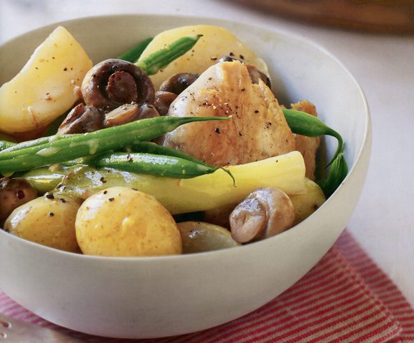 - Сварете зеления фасул – Добавете зеления фасул, похлупете и продължете да варите още 5 минути, докато пилето и зеленчуците станат готови. Разпределете с решетъчна лъжица продуктите в четири затоплени чинии или ги прехвърлете в плато за сервиране. Дръжте топли, докато приготвите соса.