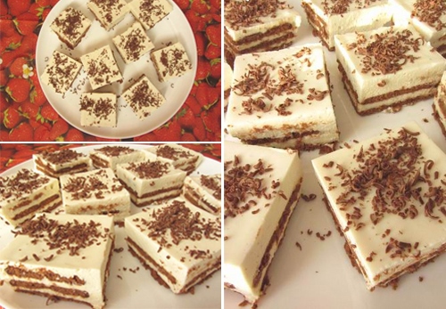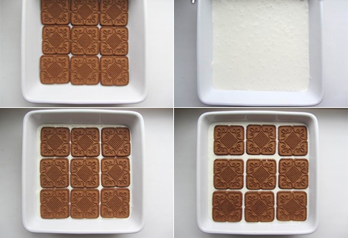 Нареждаме на дъното на продълговата или четвъртита тавичка един ред бисквити. След това заливаме с един пласт крем, дебелина колкото бисквитите. Отгоре пак слагаме втори пласт бисквити и крем и накрая завършваме с крем.