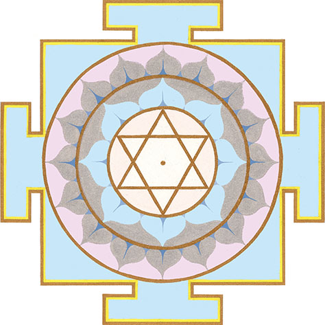 Квадратът символизира земята, материалния свят. Вписаният в него лотос с шест листенца олицетворява света на душата. Всяко листенце съответства на определена форма на душата и лотосът обединява всички тези елементи, символизирайки Душата на света. В центъра се виждат два триъгълника: единият е с върха нагоре и символизира триединния Бог, създателя, пазителя и разрушителя на Вселената – съответства на нивото на идеите. А обърнатият с върха надолу е символ на енергията на създаването, запазването и разрушението. Точката в шестоъгълника – бинду, е духовният център, съответстваща на Духа, който е единен и неделим, без начало и край.