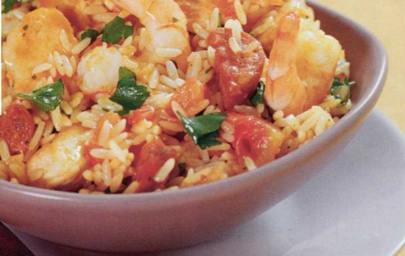 Това пъстроцветно ястие от скариди, пиле и пикантен салам чоризо има впечатляващ вид и вкус, а се приготвя съвсем лесно. Сервирайте със зелена салата.