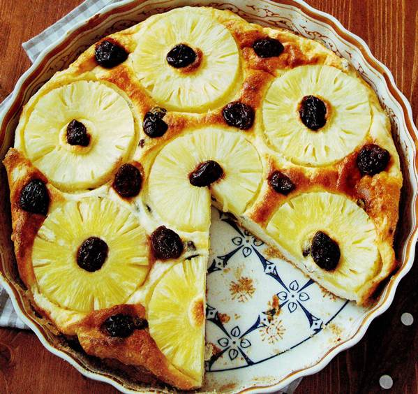 Кулинарен съвет – Можете да замените ананаса с подходящ плод според сезона – праскова, нектарина, круша, ябълка, като ги нарежете на кръгчета с дупки в средата, от където сте изчистили костилката или семената и там поставите черешите.