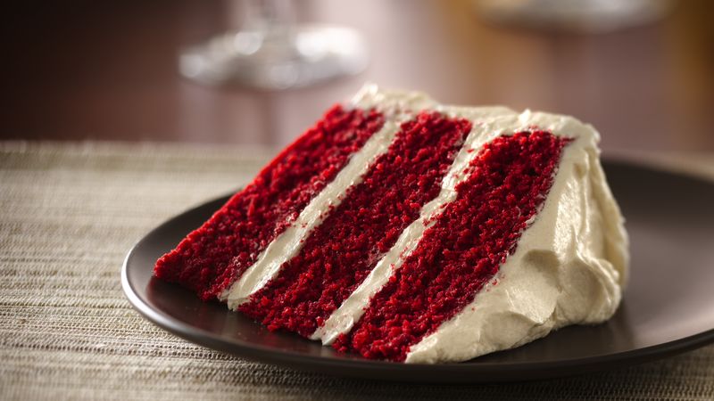 Тортата The Red Velvet Cake се прави от пандишанови блатове, оцветени в червено и покрити с белоснежна глазура
