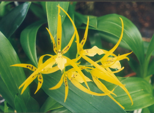 1. Орхидея паяк – брасия. Родът включва около 30 вида. Познават се лесно по тънките листенца на цветовете като крачета на насекомо, напръскани с контрастни петънца. Пъпките се разтварят последователно на цветоноса. Периодът на цъфтеж обикновено е от пролетта до есента.
