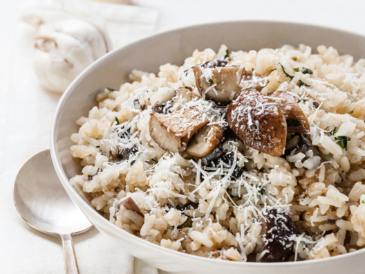 Отделно кипнете 1 л вода и разтворете кубчетата бульон. В друга тенджера загрейте зехтина и запържете за 3 минути наситнения лук, прибавете ориза и при постоянно разбъркване го запържете до прозрачност. Залейте със 100 мл вино и щом оризът го поеме, сипете 1 черпак от бульона и разбъркайте. Щом оризът поеме течността, сипете следващия черпак и повтаряйте, до-като бульонът свърши. Прибавете гъбите и половината пармезан, изчакайте 2 минути и енергично разбъркайте. Отгоре поръсете останалия пармезан и сервирайте горещо.