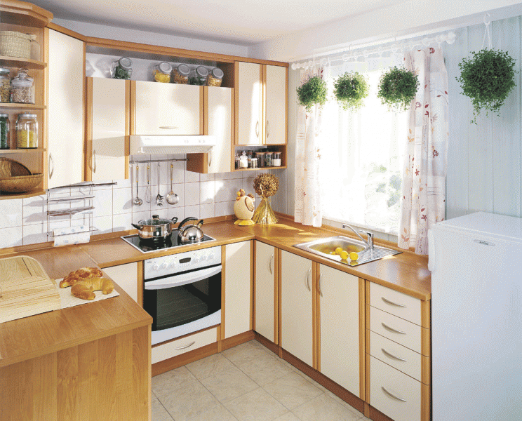 • Оптималните мебели за малка кухня са шкафове – горни и долни. Колкото по-светли и непретенциозни са мебелите, толкова по-добре. Зад стъклените врати съхранявайте стъкло, сребро и кристал, при това в идеален ред.