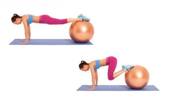 1. Легнете на дясната си страна и подпрете тавата на опъната ръка. Сгънете крака в коленете, като бедрата са почти в една линия с корпуса. Стиснете малка медицинска топка зад коляното на левия крак. След това го повдигнете нагоре, колкото можете. Бавно отпуснете обратно, без да докосвате десния крак. Направете по 15-20 повторения във всяка посока.
